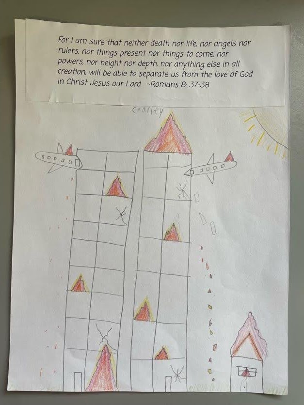 This week we also discussed the tragedies of September 11th, 2001. We watched a short video about this fateful day, and also read several books and had a very candid discussion. We made a beautiful book about our thoughts…This led to a great discussion about God and His love for us. We shared the Bible verse Romans 8: 38-39….and discussed how God will never, ever leave us. We used this verse to illustrate our thoughts of 9/11.